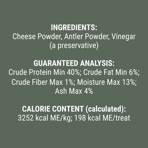 This unique combination of antler powder and cheese is a safe and healthy alternative to hard antlers, providing your pup with natural minerals, vitamins, proteins, and flavor. Antler Bone is long-lasting and supports oral health by reducing tartar and plaque buildup during chew sessions. These all-natural chews are loaded with nutrients and are easily digestible, lactose-free, with no binding agents, and no preservatives