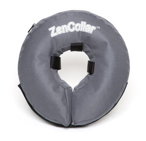 The ZenCollar has an inflatable inner bladder made of a plastic vinyl that is inflated through a two-way air valve much like a beach ball. Once inflated, the size and thickness of the ZenCollar function as a soft deterrent. The inner bladder is protected by a pliable plastic outer jacket lined with a durable canvas material to resist bites and scratches. The ZenCollar is held in place by inserting the pet's everyday collar through the the ZenCollar's three inner rings. The velcro strap should be placed at the back of the neck and then adjusted for a perfect fit.